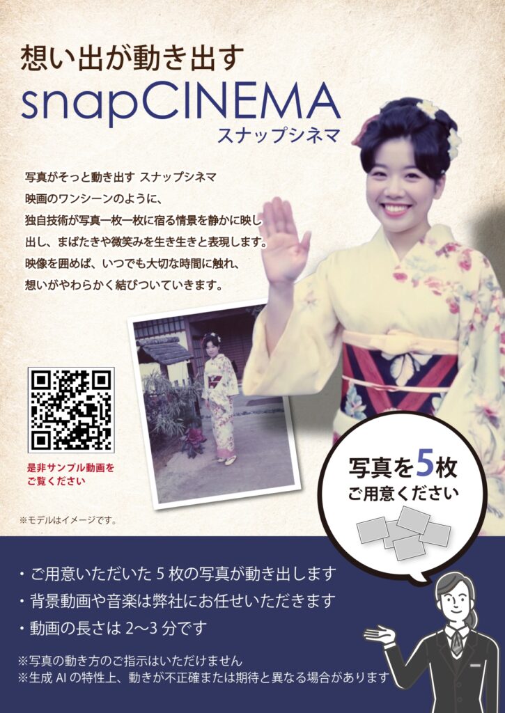 この度、おとずれでは生成AIを使用した、「SnapCINEMA スナップシネマ」のサービスを開始しました。 お客様にご用意いただくのは5枚のお写真だけ。独自の技術が、写真に宿る情景を静かに映し出し、まるで、映画のワンシーンのように大切な写真がそっと動き出します。背景やメッセージはすべてお任せできるため、お客様にお手間をかけることはございません。是非、おとずれだけの新サービスで、故人様との大切な時間をお過ごしください。